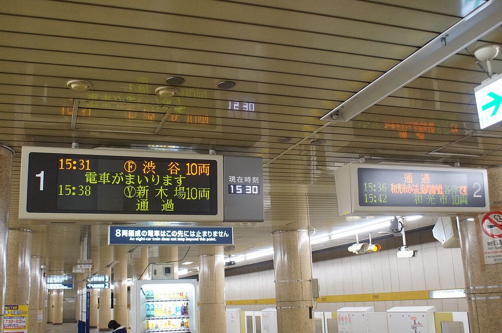 これまで行き先のみの表示だったメトロの表示器(電光掲示板)に、Y・Fの路線マークが表示されるようになりました。また、直通先の種別の表示も追加されています。(少し無理矢理ですが・・・)
