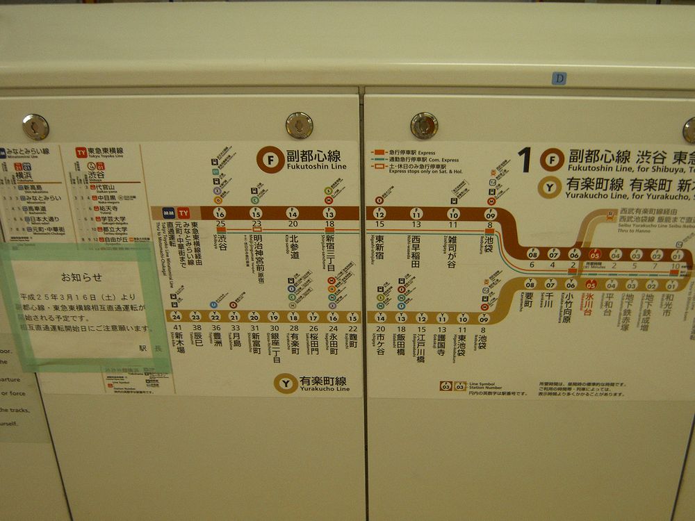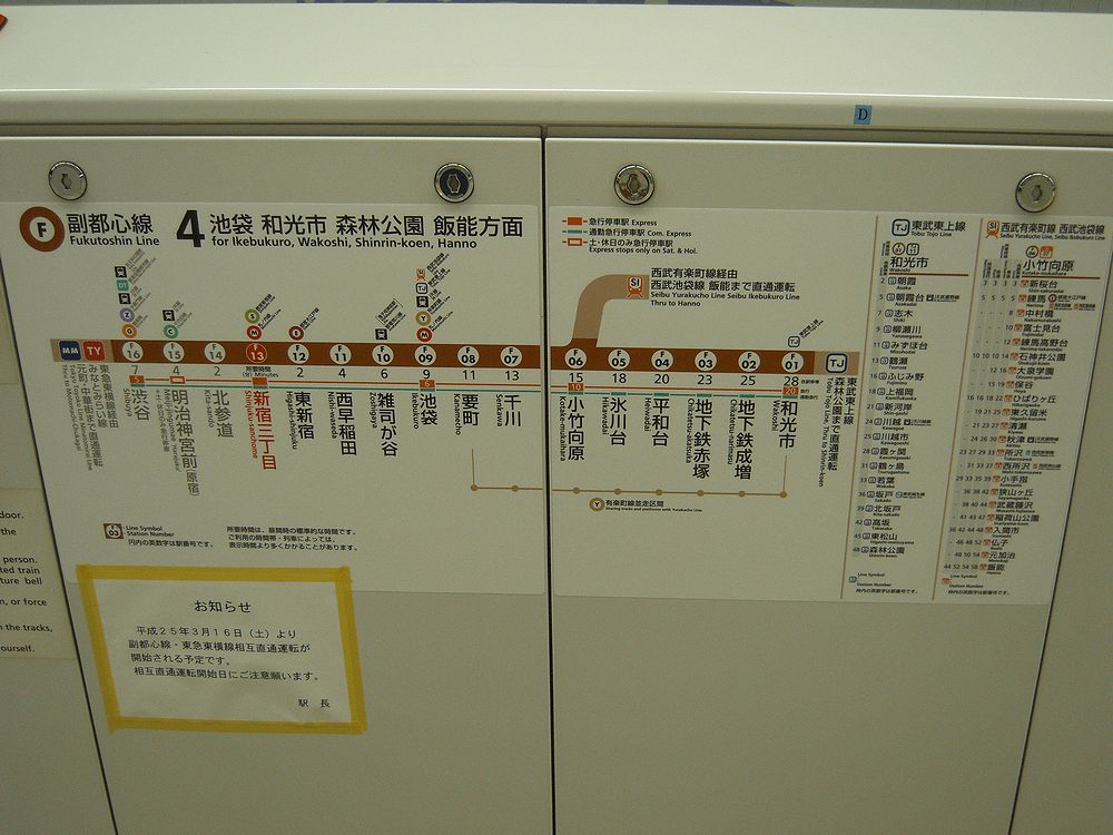 東京メトロ副都心線と東急東横線との相互直通運転まで一ヶ月を切り、各所で直通運転に向けた変化が見られるようになりました。今回は副都心線内の案内表示についてお伝えします。