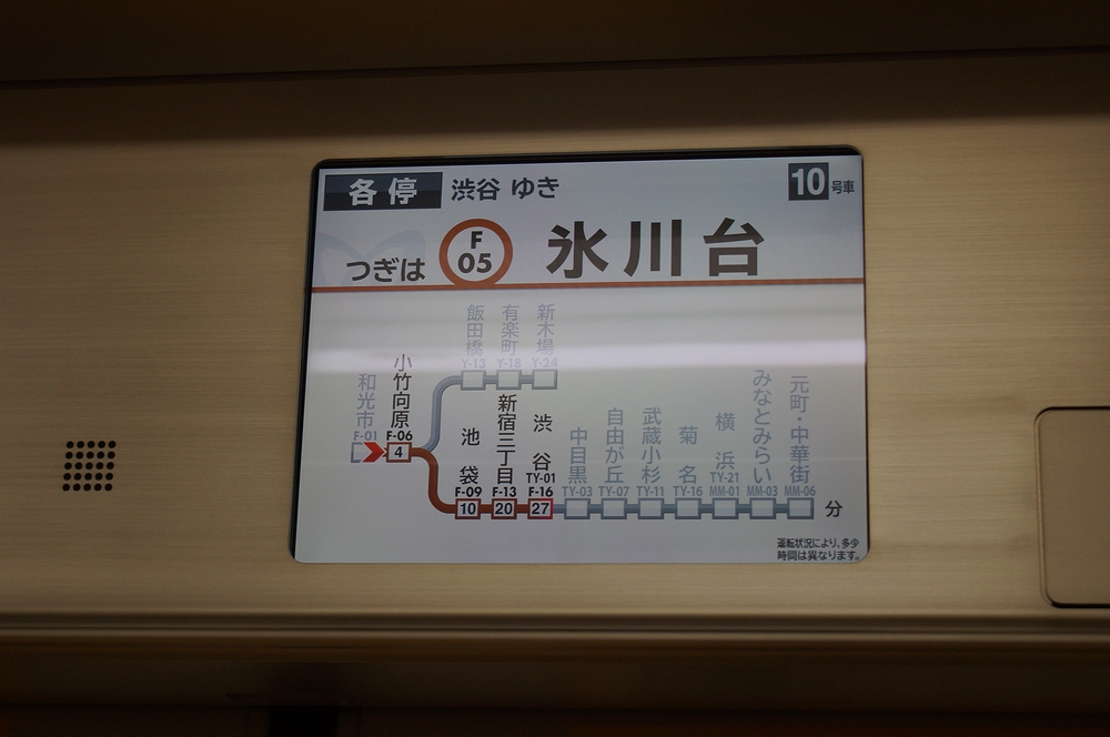 まずは10000系車内のLCDについてです。画像は直通対応にソフトが更新された東京メトロ10136FのLCDです。行き先は渋谷ですが、その先の元町・中華街まで路線図で示されています。また、行き先に関わらず有楽町線と副都心線の路線図が表示されるようになりました。これにより、電車の行き先が視覚的によりわかりやすくなりました。(同様に和光市方面も行き先に関わらず東武線・西武線の路線図が表示されます)