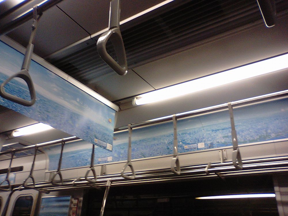 先日、副都心線に乗った際にスカイツリーのラッピングが施された東武車に偶然当たりました。車体のラッピングもさることながら、一番目を引いたのはドア位置の床にあるスカイツリーのガラス床を再現したポスターです。乗車すると目の前の床に地上350Mからの景色がありインパクトは絶大です。(これがあったため日比谷はブログを書いた)さらに、車内の広告は全てスカイツリーからの展望をイメージしたポスターになっていて、さながら展望台にいるかのような気分が味わえます。